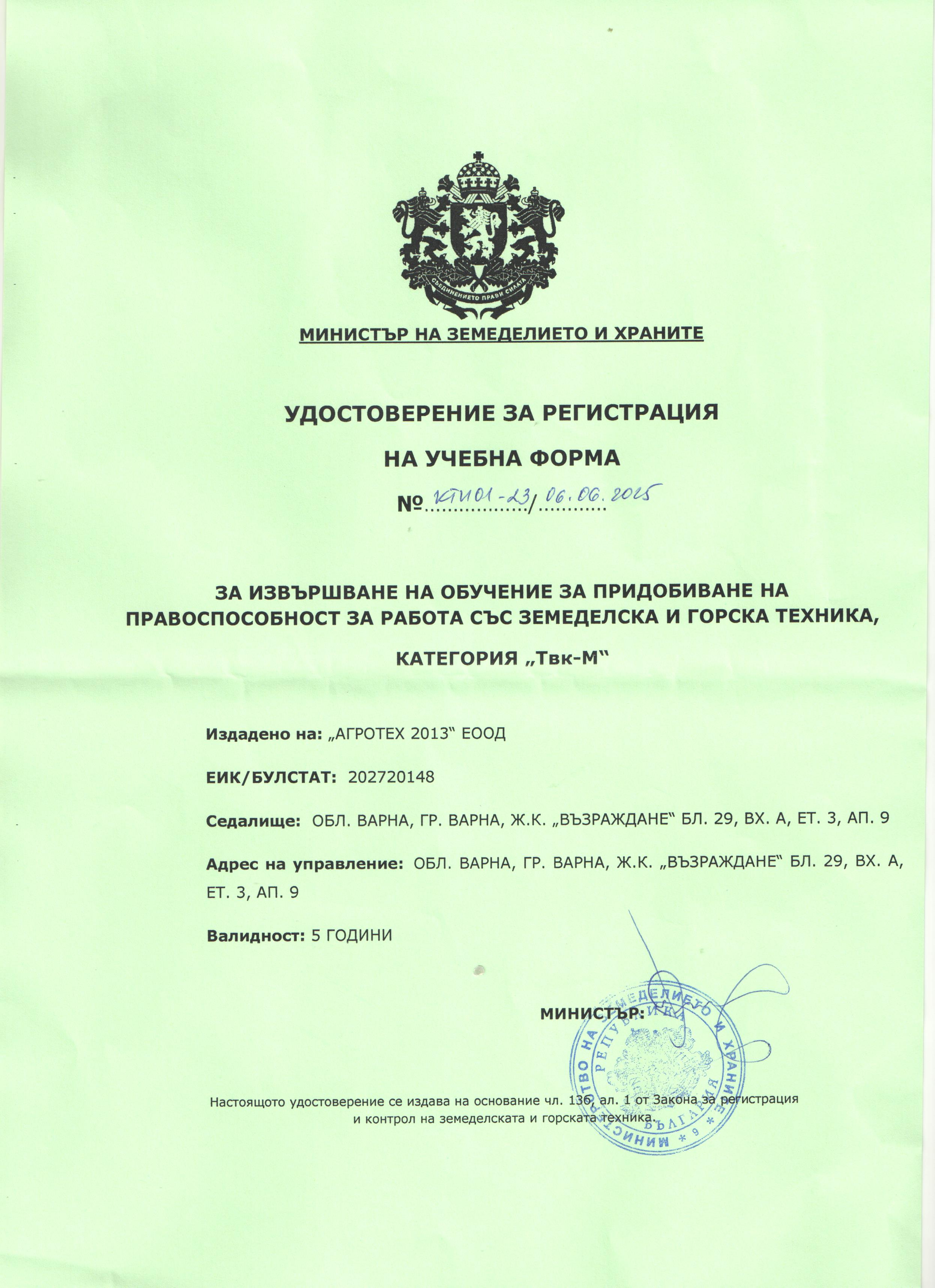 - Удостоверение за регистрация на учебна форма за извършване на обучение за категория ТВК-M
