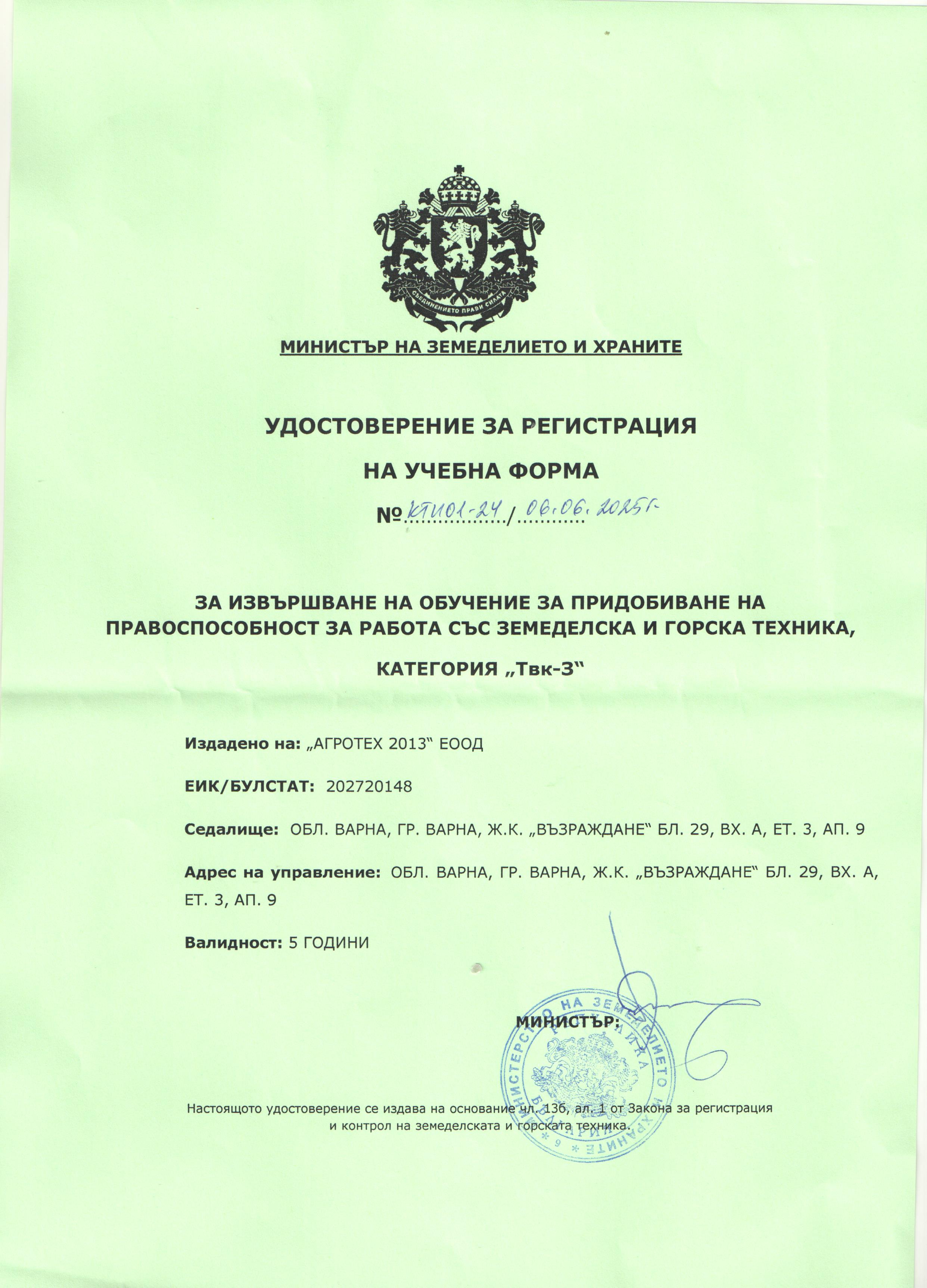 - Удостоверение за регистрация на учебна форма за извършване на обучение за категория ТВК-З
