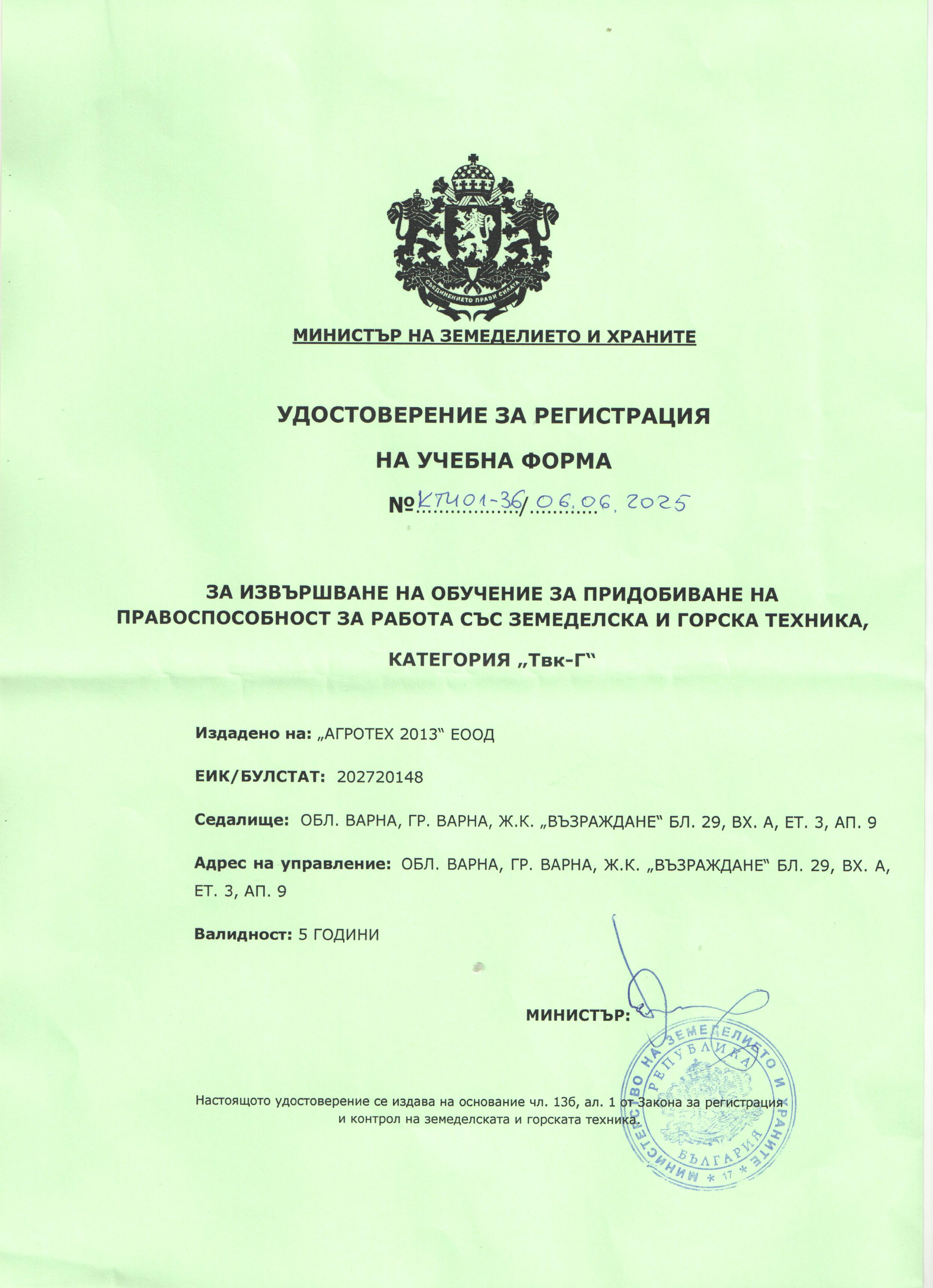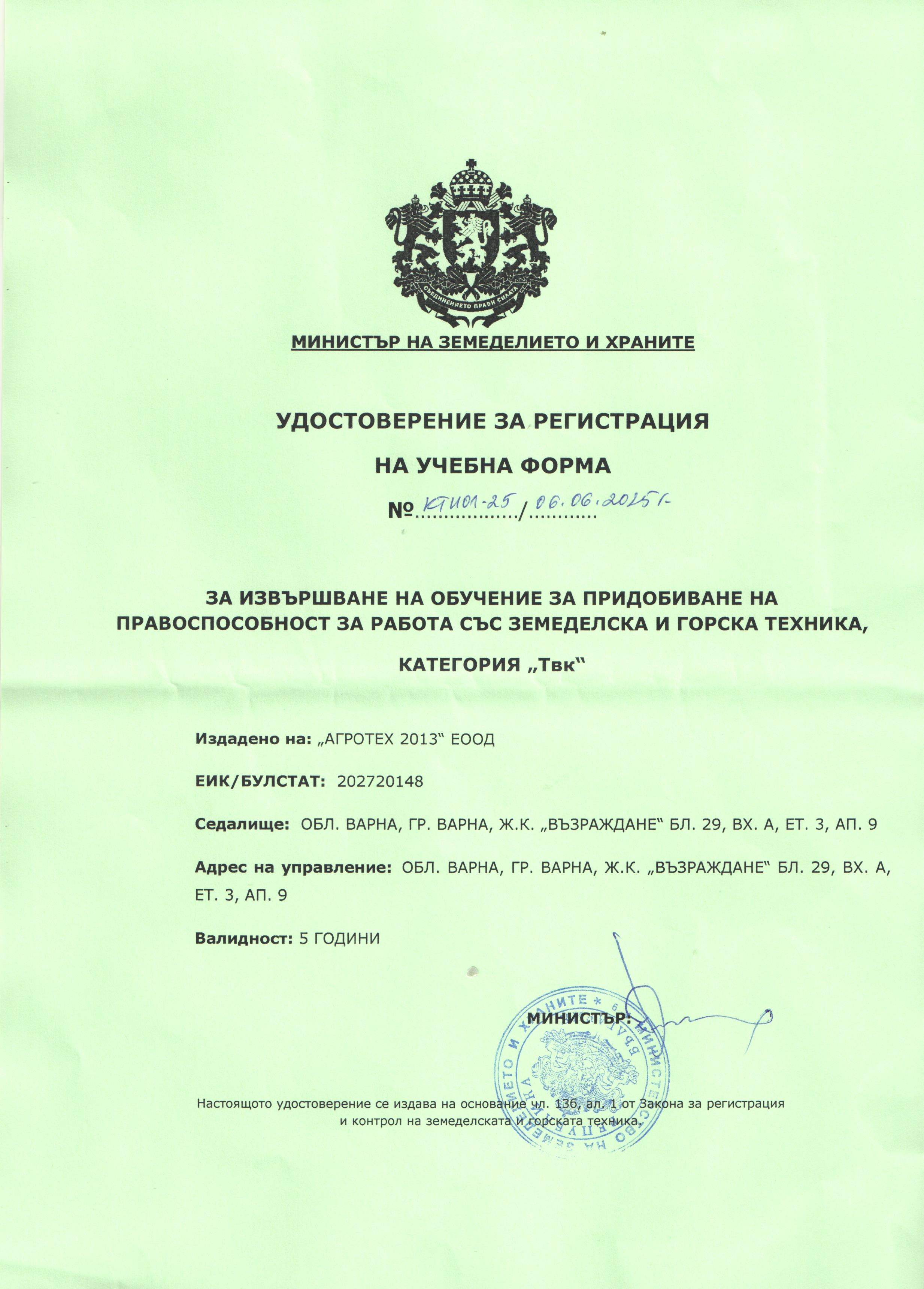 - Удостоверение за регистрация на учебна форма за извършване на обучение за категория ТВК-Г